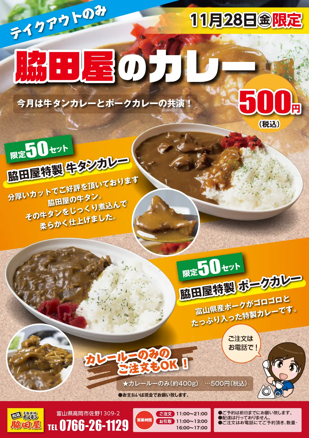 「脇田屋特製 牛タンカレー」は50食限定、「脇田屋特製 ポークカレー」は50食限定。お好きなカレーをお選びください!